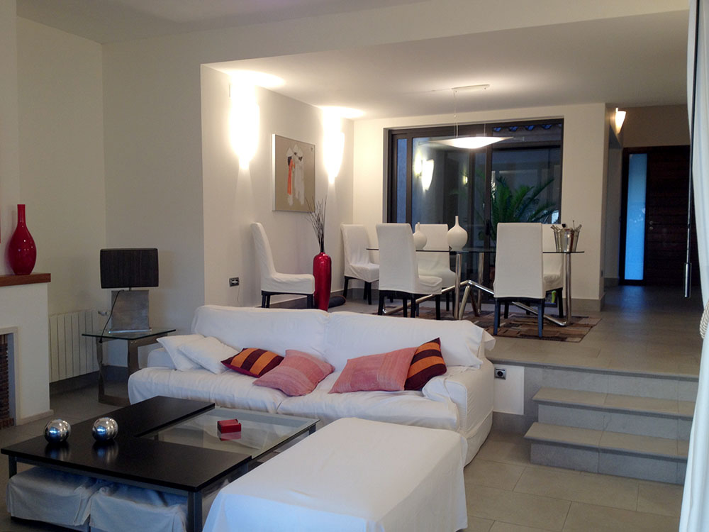 La división en dos alturas de esta estancia invitaba a crear dos espacios diferenciados, sin ninguna barrera visual. La parte inferior está pensada para el día a día de la familia. Salvando tres escalones, una zona más formal, a modo de comedor en el que compartir mesa y mantel con amigos y familiares en ocasiones especiales. La iluminación ayuda a crear un toque acogedor y especial.